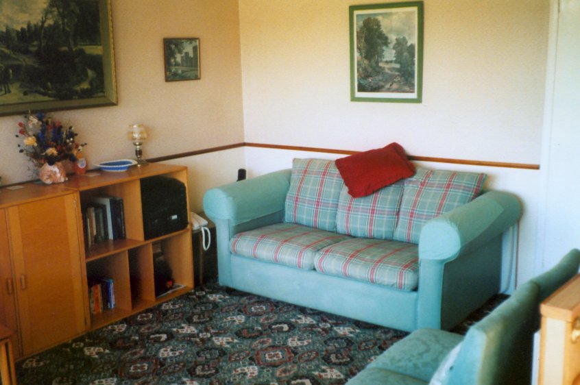 a colour T.V, DVD/CD and a small hi-fi unit. The bathroom is